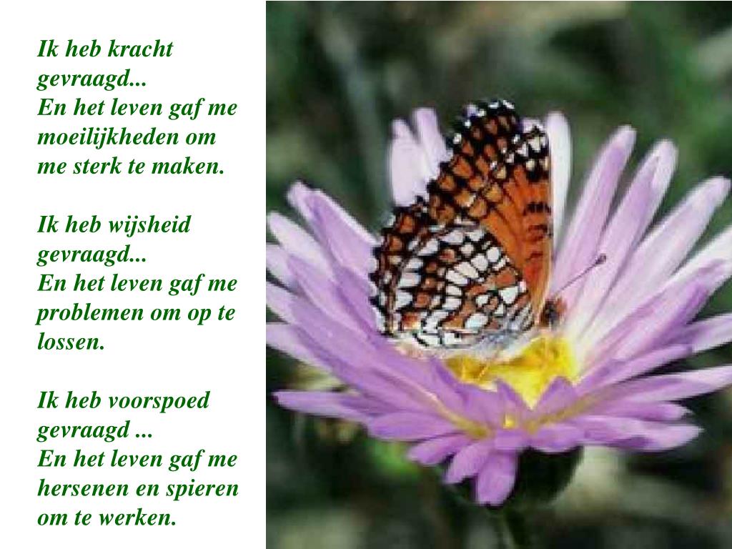 Ik heb kracht gevraagd... En het leven gaf me moeilijkheden om me sterk te maken. Ik heb wijsheid gevraagd... En het leven gaf me problemen om op te lossen. Ik heb voorspoed gevraagd ... En het leven gaf me hersenen en spieren om te werken.