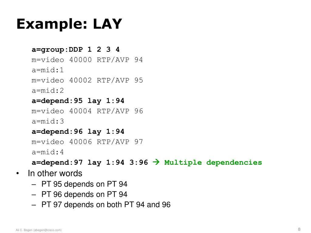 Example: LAY a=group:DDP 1 2 3 4 m=video 40000 RTP/AVP 94 a=mid:1 m=video 40002 RTP/AVP 95 a=mid:2 a=depend:95 lay 1:94 m=video 40004 RTP/AVP 96 a=mid:3 a=depend:96 lay 1:94 m=video 40006 RTP/AVP 97 a=mid:4 a=depend:97 lay 1:94 3:96 Multiple dependencies • In other words • PT 95 depends on PT 94 • PT 96 depends on PT 94 • PT 97 depends on both PT 94 and 96