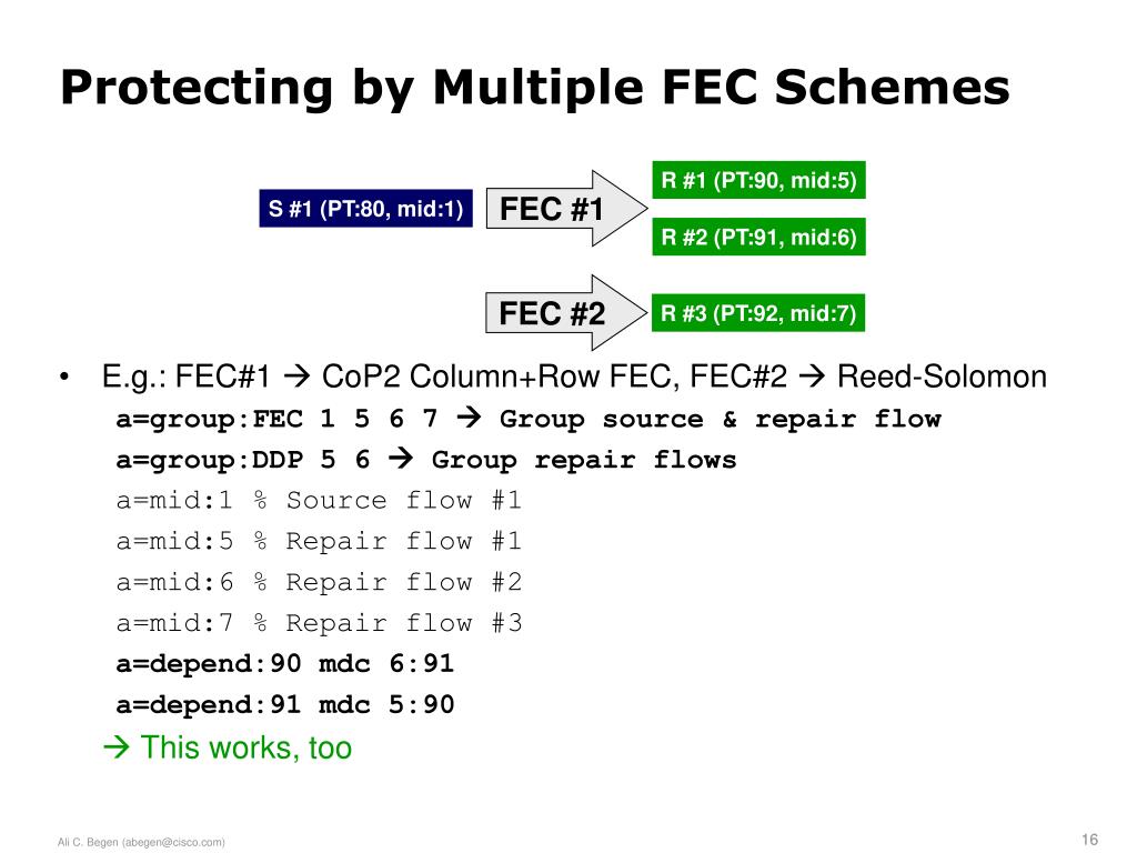 Protecting a Group of Source Flows R #1 (PT:90, mid:5) • We could write a=group:FEC 1 2 5 6 Group source & repair flows a=group:DDP 5 6 Group repair flows a=mid:1 % Source flow #1 a=mid:2 % Source flow #2 a=mid:5 % Repair flow #1 a=mid:6 % Repair flow #2 a=depend:90 mdc 6:91 a=depend:91 mdc 5:90 OR a=depend:91 lay 5:90 This works, too S #1 (PT:80, mid:1) FEC #1 R #2 (PT:91, mid:6) S #2 (PT:81, mid:2) R #1 (PT:90, mid:5) R #2 (PT:91, mid:6) R #1 (PT:90, mid:5) R #2 (PT:91, mid:6)