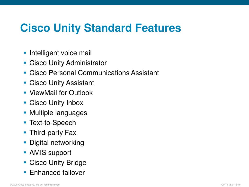 Cisco Unity Standard Features Intelligent voice mail Cisco Unity Administrator Cisco Personal Communications Assistant Cisco Unity Assistant ViewMail for Outlook Cisco Unity Inbox Multiple languages Text-to-Speech Third-party Fax Digital networking AMIS support Cisco Unity Bridge Enhanced failover