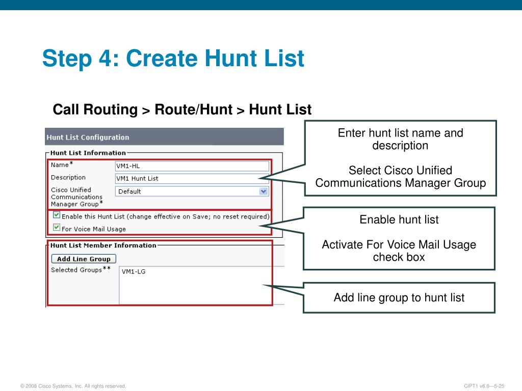 Step 4: Create Hunt List Call Routing > Route/Hunt > Hunt List Enter hunt list name and description Select Cisco Unified Communications Manager Group Enable hunt list Activate For Voice Mail Usage check box Add line group to hunt list