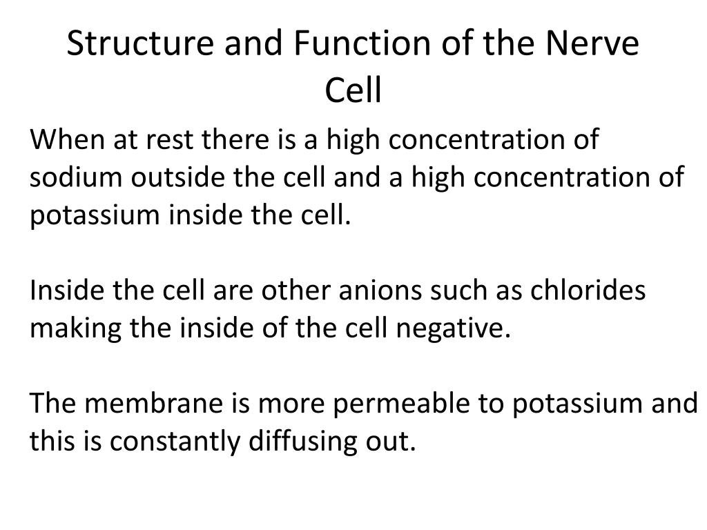 Structure and Function of the Nerve Cell When at rest there is a high concentration of sodium outside the cell and a high concentration of potassium inside the cell. Inside the cell are other anions such as chlorides making the inside of the cell negative. The membrane is more permeable to potassium and this is constantly diffusing out.