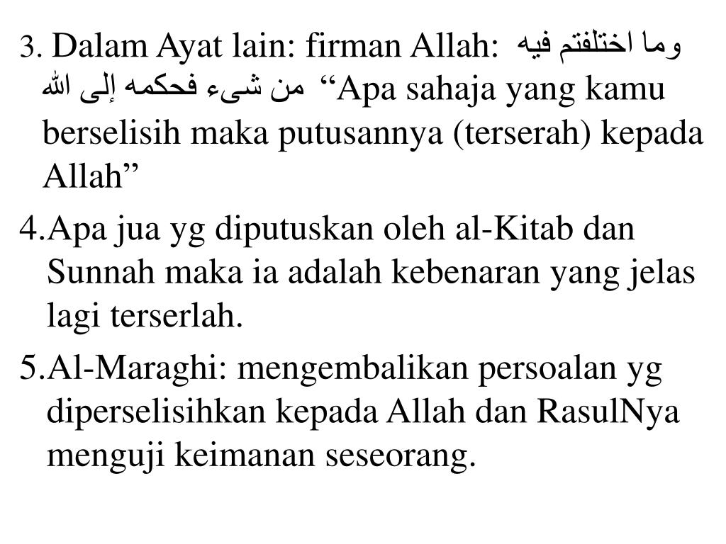 3. DalamAyat lain: firman Allah: وما اختلفتم فيه من شىء فحكمه إلى الله“Apasahaja yang kamuberselisihmakaputusannya (terserah) kepada Allah” Apajuaygdiputuskanoleh al-KitabdanSunnahmakaiaadalahkebenaran yang jelaslagiterserlah. Al-Maraghi: mengembalikanpersoalanygdiperselisihkankepada Allah danRasulNyamengujikeimananseseorang.