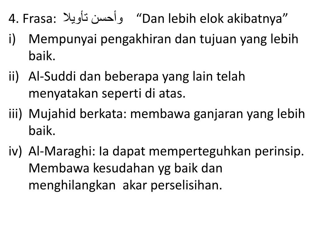 4. Frasa: وأحسن تأويلا “Dan lebihelokakibatnya” Mempunyaipengakhirandantujuan yang lebihbaik. Al-Suddidanbeberapa yang lain telahmenyatakansepertidiatas. Mujahidberkata: membawaganjaran yang lebihbaik. Al-Maraghi: Iadapatmemperteguhkanperinsip. Membawakesudahanygbaikdanmenghilangkanakarperselisihan.