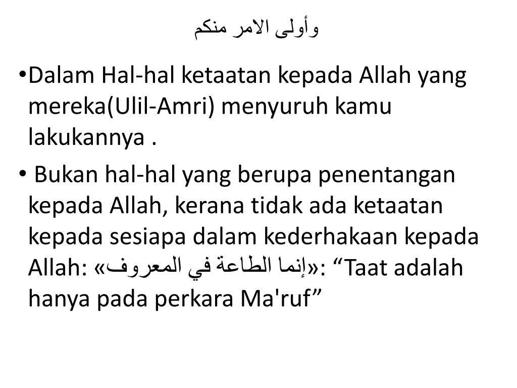 وأولى الامر منكم Dalam Hal-halketaatankepada Allah yang mereka(Ulil-Amri) menyuruhkamulakukannya . Bukanhal-hal yang berupapenentangankepada Allah, keranatidakadaketaatankepadasesiapadalamkederhakaankepada Allah: «إنما الطاعة في المعروف»: “TaatadalahhanyapadaperkaraMa'ruf”