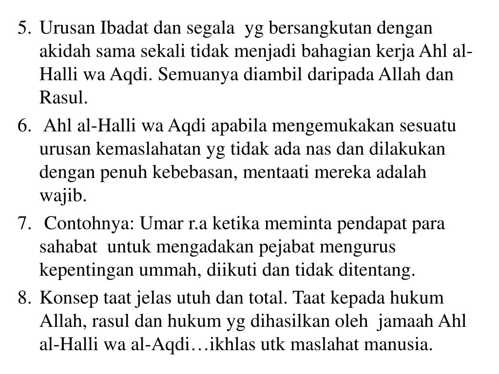 UrusanIbadatdansegalaygbersangkutandenganakidahsamasekalitidakmenjadibahagiankerjaAhl al-HalliwaAqdi. Semuanyadiambildaripada Allah danRasul. Ahl al-HalliwaAqdiapabilamengemukakansesuatuurusankemaslahatanygtidakadanasdandilakukandenganpenuhkebebasan, mentaatimerekaadalahwajib. Contohnya: Umarr.aketikamemintapendapatparasahabatuntukmengadakanpejabatmenguruskepentinganummah, diikutidantidakditentang. Konseptaatjelasutuhdan total. Taatkepadahukum Allah, rasuldanhukumygdihasilkanolehjamaahAhl al-Halliwa al-Aqdi…ikhlasutkmaslahatmanusia.
