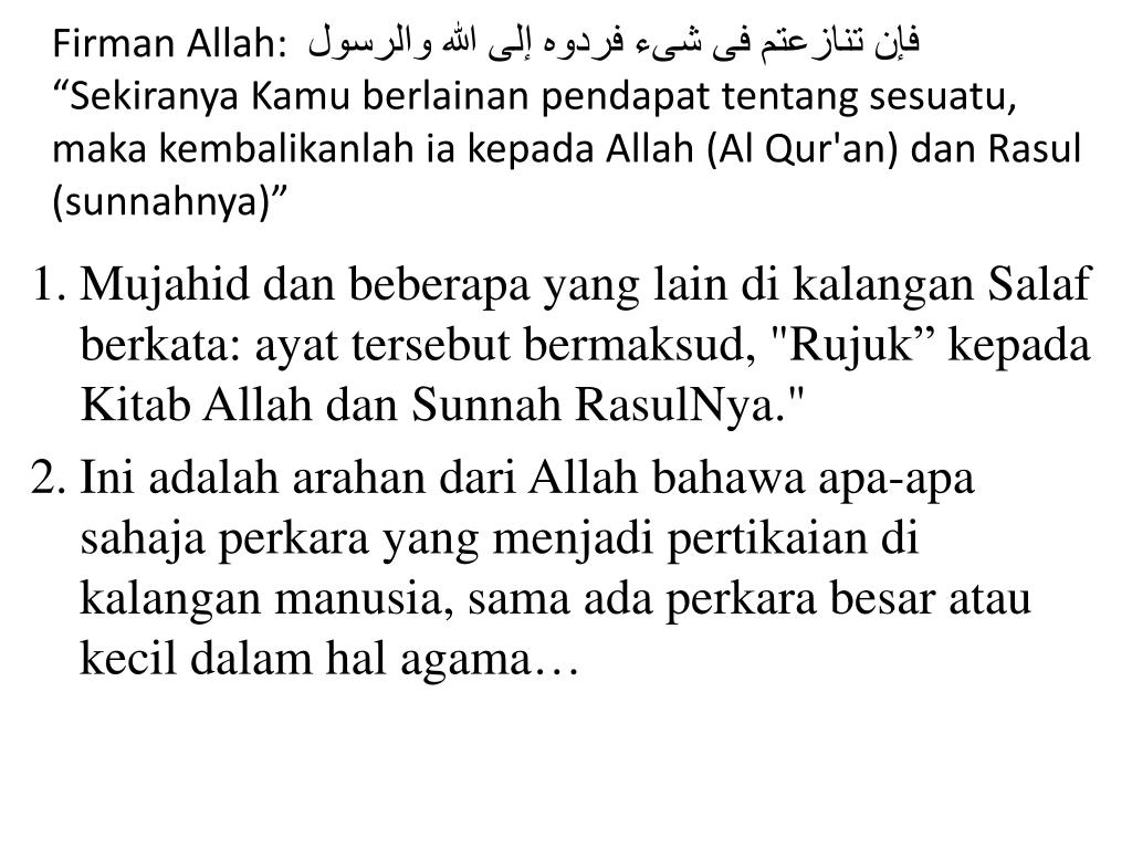Firman Allah: فإن تنازعتم فى شىء فردوه إلى الله والرسول“Sekiranya Kamu berlainan pendapat tentang sesuatu, maka kembalikanlah ia kepada Allah (Al Qur'an) dan Rasul (sunnahnya)” Mujahiddanbeberapa yang lain dikalanganSalafberkata: ayattersebutbermaksud, "Rujuk” kepadaKitab Allah danSunnahRasulNya." Iniadalaharahandari Allah bahawaapa-apasahajaperkara yang menjadipertikaiandikalanganmanusia, samaadaperkarabesarataukecildalamhal agama…