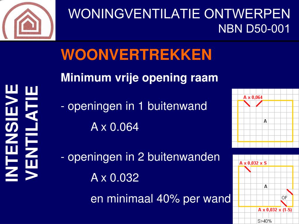 WONINGVENTILATIE ONTWERPEN NBN D50-001 • WOONVERTREKKEN • Minimum vrije opening raam • openingen in 1 buitenwand • A x 0.064 • openingen in 2 buitenwanden • A x 0.032 • en minimaal 40% per wand INTENSIEVE VENTILATIE