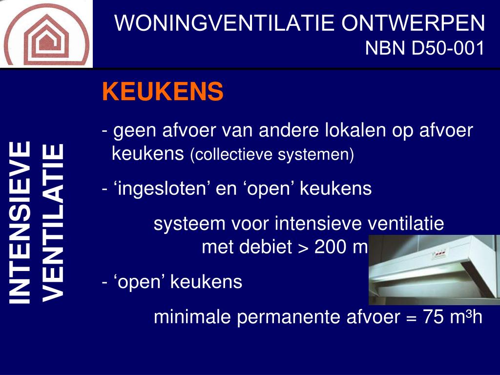 WONINGVENTILATIE ONTWERPEN NBN D50-001 • KEUKENS • -geen afvoer van andere lokalen op afvoer keukens (collectieve systemen) • - ‘ingesloten’ en ‘open’ keukens • systeem voor intensieve ventilatie met debiet > 200 m³/u • ‘open’ keukens • minimale permanente afvoer = 75 m³h INTENSIEVE VENTILATIE