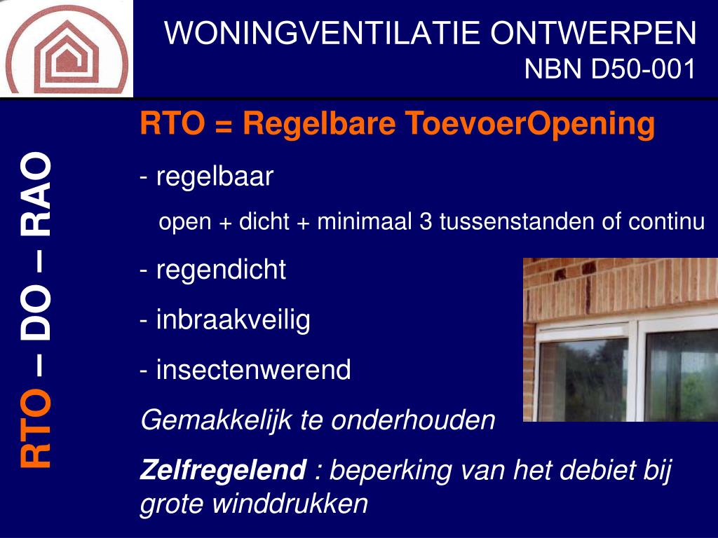 WONINGVENTILATIE ONTWERPEN NBN D50-001 • RTO= Regelbare ToevoerOpening • regelbaar • open + dicht + minimaal 3 tussenstanden of continu • - regendicht • - inbraakveilig • - insectenwerend • Gemakkelijk te onderhouden • Zelfregelend : beperking van het debiet bij grote winddrukken RTO – DO – RAO