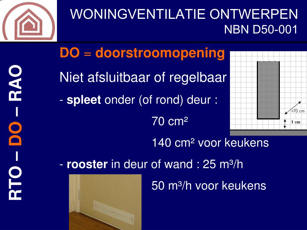 WONINGVENTILATIE ONTWERPEN NBN D50-001 • DO = doorstroomopening • Niet afsluitbaar of regelbaar • spleet onder (of rond) deur : • 70 cm² • 140 cm² voor keukens • rooster in deur of wand : 25 m³/h • 50 m³/h voor keukens RTO – DO – RAO