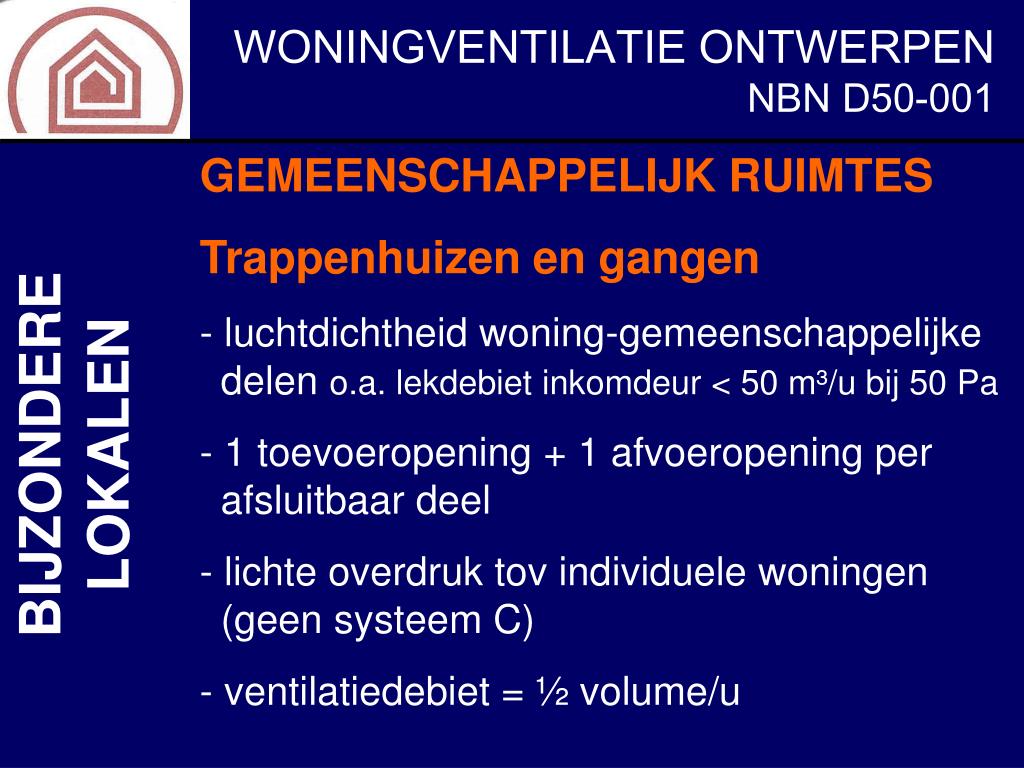 WONINGVENTILATIE ONTWERPEN NBN D50-001 • GEMEENSCHAPPELIJK RUIMTES • Trappenhuizen en gangen • luchtdichtheid woning-gemeenschappelijke delen o.a. lekdebiet inkomdeur < 50 m³/u bij 50 Pa • 1 toevoeropening + 1 afvoeropening per afsluitbaar deel • lichte overdruk tov individuele woningen (geen systeem C) • ventilatiedebiet = ½ volume/u BIJZONDERE LOKALEN