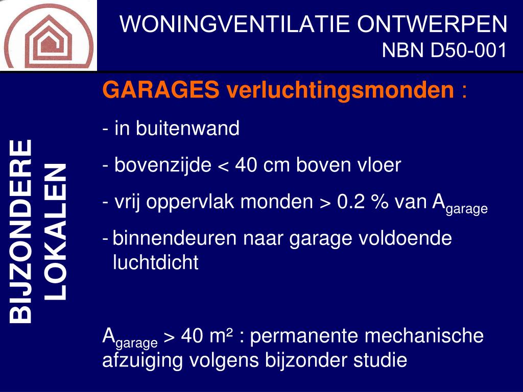 WONINGVENTILATIE ONTWERPEN NBN D50-001 • GARAGES verluchtingsmonden : • in buitenwand • bovenzijde < 40 cm boven vloer • vrij oppervlak monden > 0.2 % van Agarage • binnendeuren naar garage voldoende luchtdicht • Agarage > 40 m² : permanente mechanische afzuiging volgens bijzonder studie BIJZONDERE LOKALEN