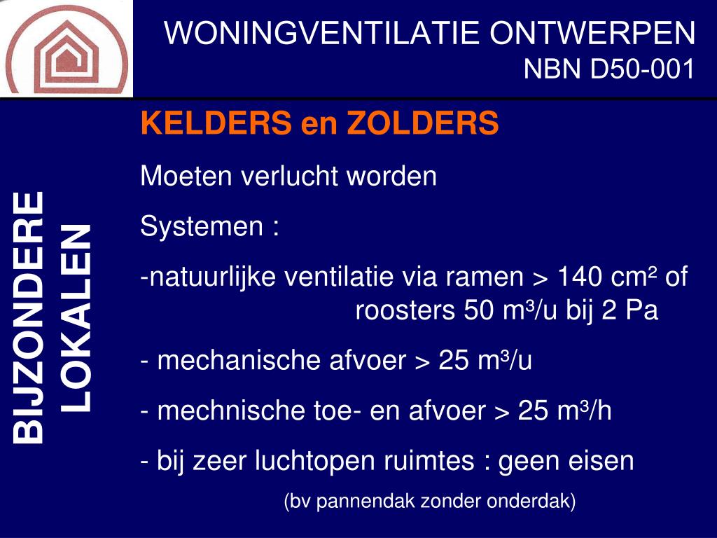 WONINGVENTILATIE ONTWERPEN NBN D50-001 • KELDERS en ZOLDERS • Moeten verlucht worden • Systemen : • natuurlijke ventilatie via ramen > 140 cm² of roosters 50 m³/u bij 2 Pa • mechanische afvoer > 25 m³/u • mechnische toe- en afvoer > 25 m³/h • bij zeer luchtopen ruimtes : geen eisen • (bv pannendak zonder onderdak) BIJZONDERE LOKALEN