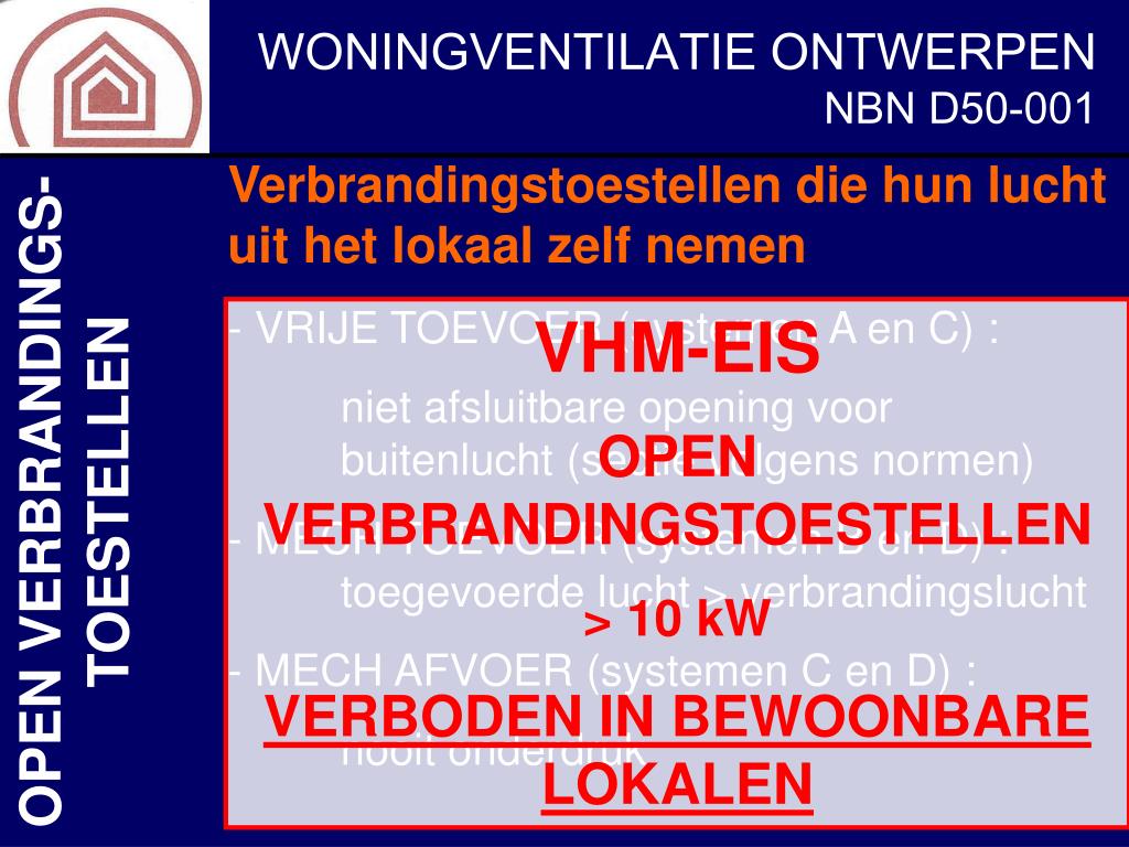 WONINGVENTILATIE ONTWERPEN NBN D50-001 • Verbrandingstoestellen die hun lucht uit het lokaal zelf nemen • - VRIJE TOEVOER (systemen A en C) : • niet afsluitbare opening voor buitenlucht (sectie volgens normen) • MECH TOEVOER (systemen B en D) : toegevoerde lucht > verbrandingslucht • MECH AFVOER (systemen C en D) : • nooit onderdruk VHM-EIS OPEN VERBRANDINGSTOESTELLEN > 10 kW VERBODEN IN BEWOONBARE LOKALEN OPEN VERBRANDINGS- TOESTELLEN