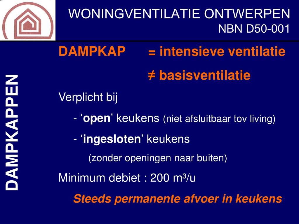WONINGVENTILATIE ONTWERPEN NBN D50-001 • DAMPKAP = intensieve ventilatie • ≠ basisventilatie • Verplicht bij • ‘open’ keukens (niet afsluitbaar tov living) • ‘ingesloten’ keukens • (zonder openingen naar buiten) • Minimum debiet : 200 m³/u • Steeds permanente afvoer in keukens DAMPKAPPEN