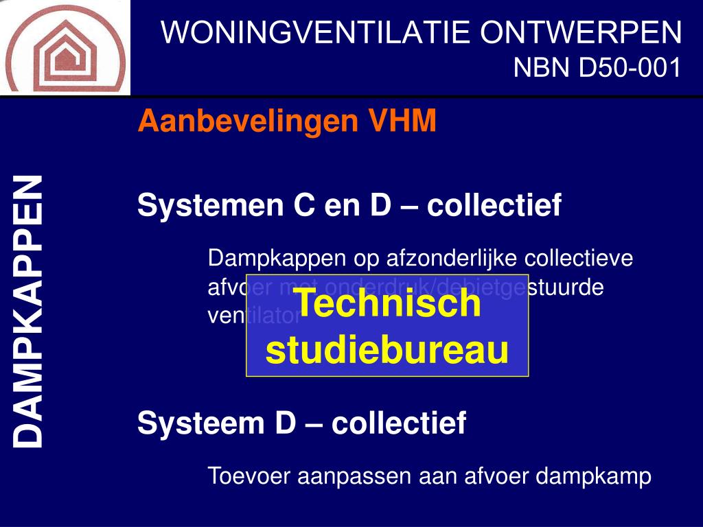 WONINGVENTILATIE ONTWERPEN NBN D50-001 Aanbevelingen VHM Systemen C en D – collectief Dampkappen op afzonderlijke collectieve afvoer met onderdruk/debietgestuurde ventilator Systeem D – collectief Toevoer aanpassen aan afvoer dampkamp DAMPKAPPEN Technisch studiebureau