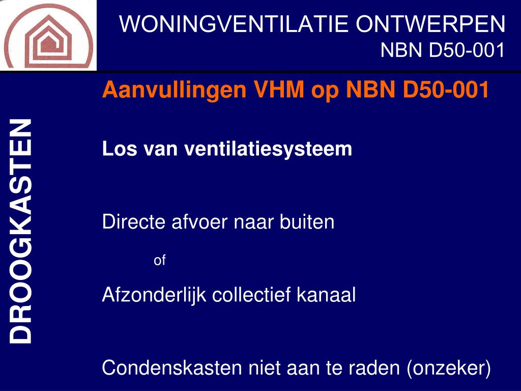 WONINGVENTILATIE ONTWERPEN NBN D50-001 Aanvullingen VHM op NBN D50-001 Los van ventilatiesysteem Directe afvoer naar buiten of Afzonderlijk collectief kanaal Condenskasten niet aan te raden (onzeker) DROOGKASTEN