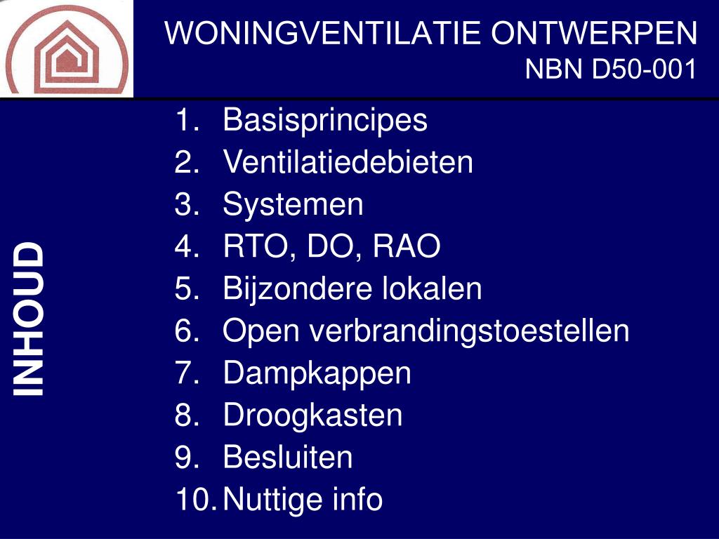 WONINGVENTILATIE ONTWERPEN • NBN D50-001 • Basisprincipes • Ventilatiedebieten • Systemen • RTO, DO, RAO • Bijzondere lokalen • Open verbrandingstoestellen • Dampkappen • Droogkasten • Besluiten • Nuttige info INHOUD