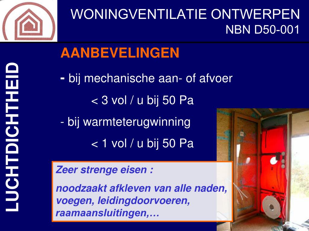 WONINGVENTILATIE ONTWERPEN • NBN D50-001 AANBEVELINGEN - bij mechanische aan- of afvoer < 3 vol / u bij 50 Pa - bijwarmteterugwinning < 1 vol / u bij 50 Pa LUCHTDICHTHEID Zeer strenge eisen : noodzaakt afkleven van alle naden, voegen, leidingdoorvoeren, raamaansluitingen,…