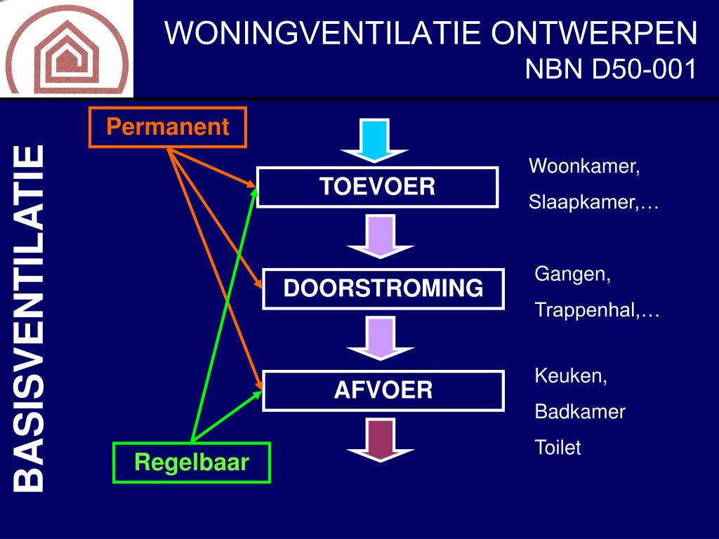 WONINGVENTILATIE ONTWERPEN NBN D50-001 Permanent Woonkamer, Slaapkamer,… TOEVOER Gangen, Trappenhal,… DOORSTROMING BASISVENTILATIE Keuken, Badkamer Toilet AFVOER Regelbaar