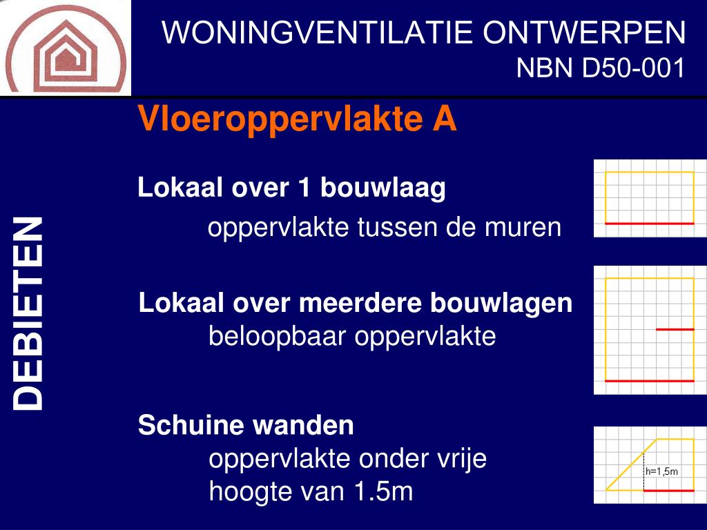 WONINGVENTILATIE ONTWERPEN NBN D50-001 Vloeroppervlakte A Lokaal over 1 bouwlaag oppervlakte tussen de muren DEBIETEN Lokaal over meerdere bouwlagen beloopbaar oppervlakte Schuine wanden oppervlakte onder vrije hoogte van 1.5m