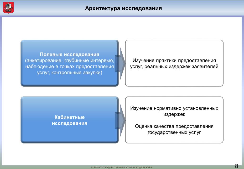 Алгоритмвыполненияработ Разработка методологического обеспечения проведения исследования Оценка нормативно установленных издержек (на основе анализа НПА) Оценка реальных издержек получателей услуг на основе используемых методов исследования Оценка доступности и комфортности предоставления услуг Описание реальной практики предоставления услуги Комплексная оценка качества услуг Выявление основных актуальных проблем предоставления услуги Разработка предложений по повышению качества услуг 7