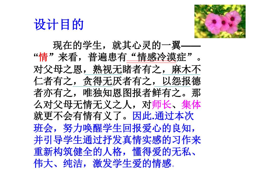 设计目的 现在的学生,就其心灵的一翼——“情”来看,普遍患有“情感冷漠症”。对父母之恩,熟视无睹者有之,麻木不仁者有之,贪得无厌者有之,以怨报德者亦有之,唯独知恩图报者鲜有之。那么对父母无情无义之人,对师长、集体就更不会有情有义了。因此.通过本次班会,努力唤醒学生回报爱心的良知,并引导学生通过抒发真情实感的习作来重新构筑健全的人格,懂得爱的无私、伟大、纯洁,激发学生爱的情感。