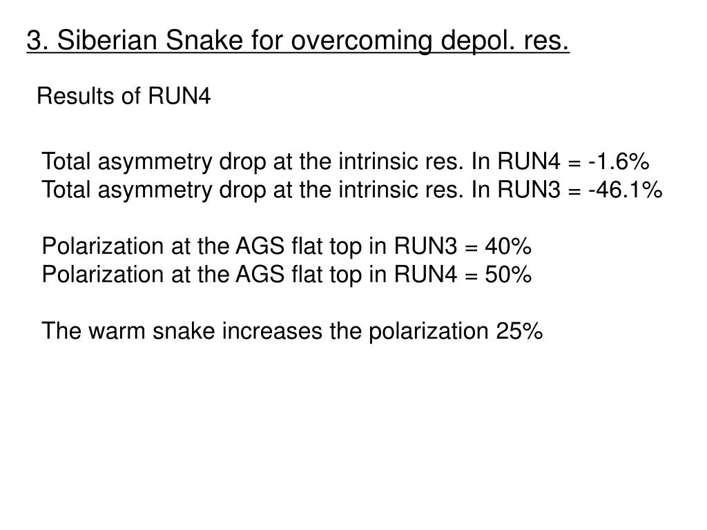 3. Siberian Snake for overcoming depol. res. 12+v 36-v 24+v 48-v 36+v RUN4 -7.2% +1.5% +4.6% -0.5% -8.2% RUN3 N/A -13.4% -6.9% -8.3% -17.5%