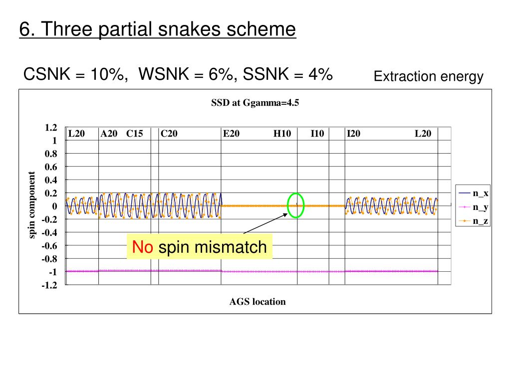 6. Three partial snakes scheme CSNK = 10%, WSNK = 6%, SSNK = 4% Extraction energy No spin mismatch