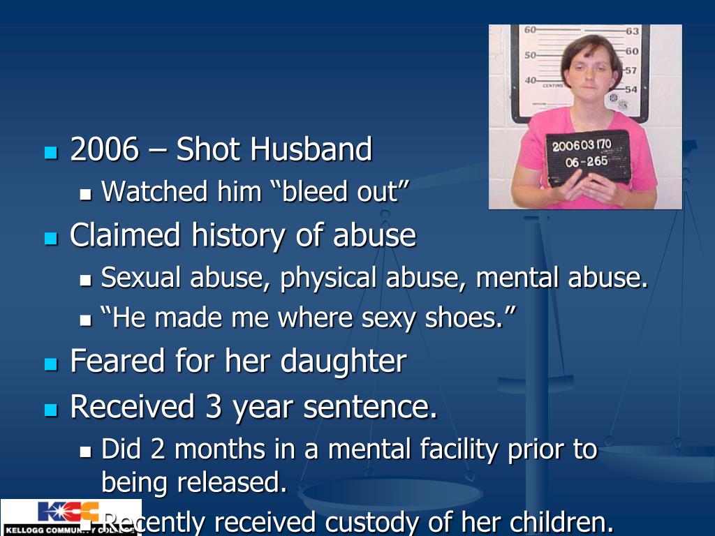2006 – Shot Husband • Watched him “bleed out” • Claimed history of abuse • Sexual abuse, physical abuse, mental abuse. • “He made me where sexy shoes.” • Feared for her daughter • Received 3 year sentence. • Did 2 months in a mental facility prior to being released. • Recently received custody of her children.