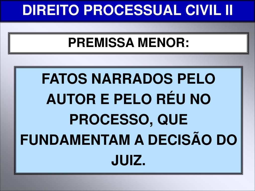 DIREITO PROCESSUAL CIVIL II PREMISSA MENOR: FATOS NARRADOS PELO AUTOR E PELO RÉU NO PROCESSO, QUE FUNDAMENTAM A DECISÃO DO JUIZ.