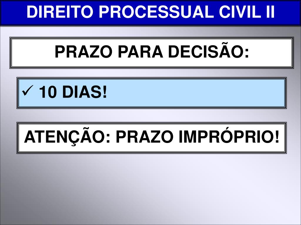 DIREITO PROCESSUAL CIVIL II PRAZO PARA DECISÃO: • 10 DIAS! ATENÇÃO: PRAZO IMPRÓPRIO!