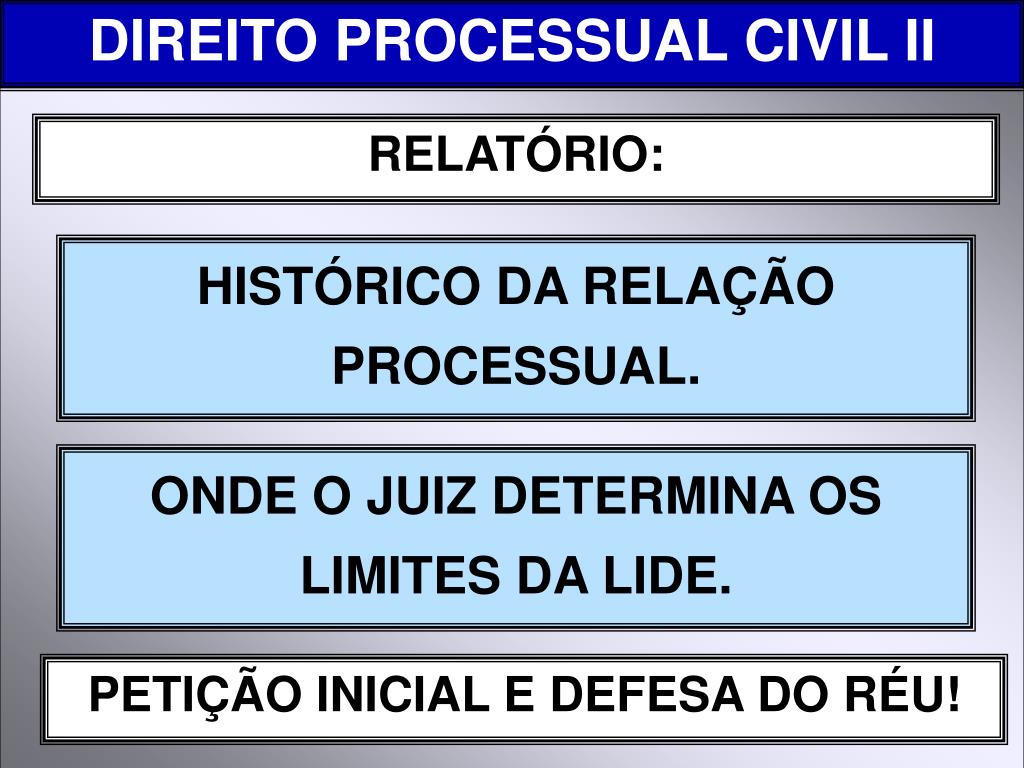 DIREITO PROCESSUAL CIVIL II RELATÓRIO: HISTÓRICO DA RELAÇÃO PROCESSUAL. ONDE O JUIZ DETERMINA OS LIMITES DA LIDE. PETIÇÃO INICIAL E DEFESA DO RÉU!
