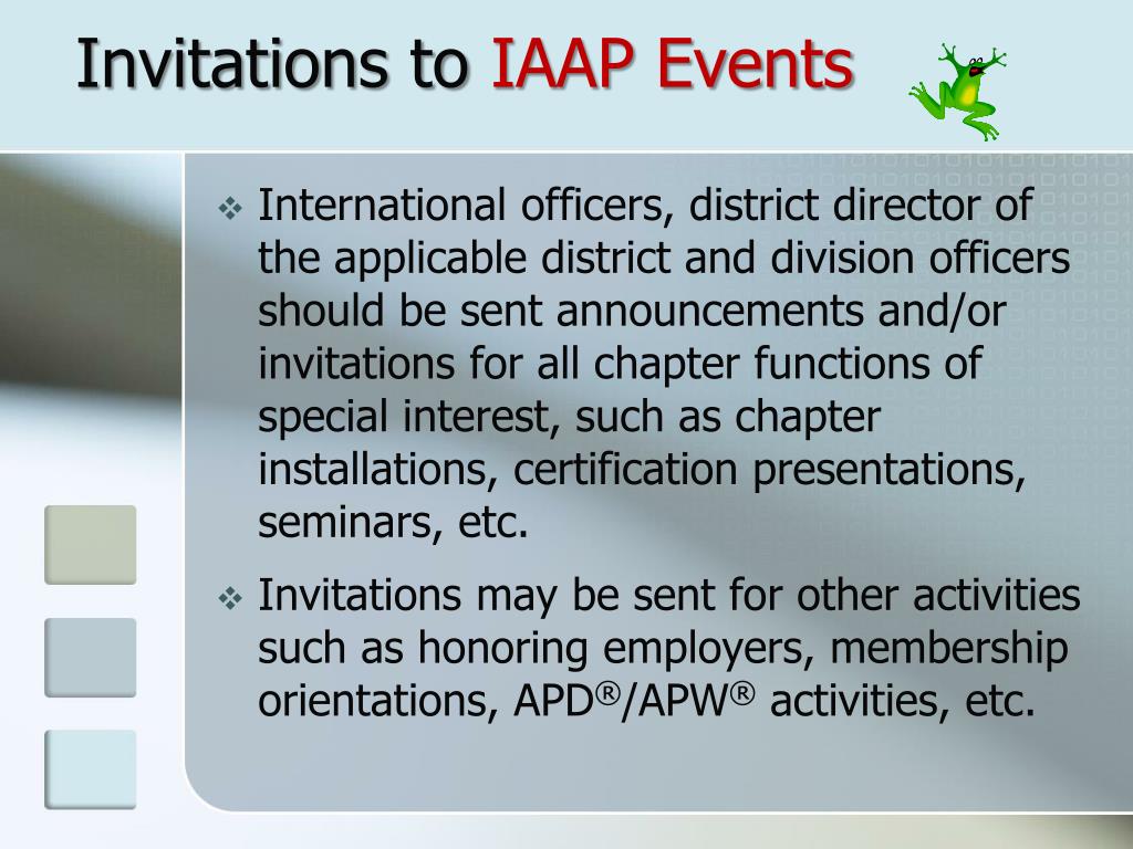 Invitations to IAAP Events • International officers, district director of the applicable district and division officers should be sent announcements and/or invitations for all chapter functions of special interest, such as chapter installations, certification presentations, seminars, etc. • Invitations may be sent for other activities such as honoring employers, membership orientations, APD®/APW® activities, etc.