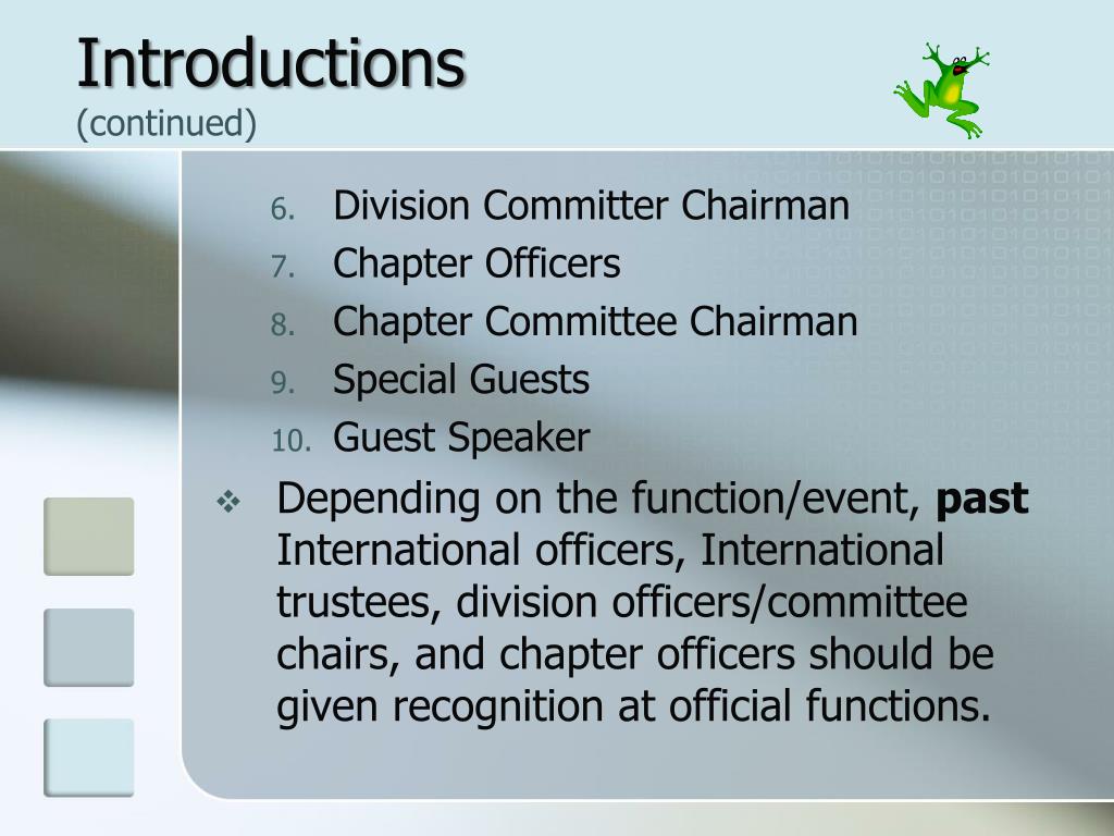Introductions • (continued) • Division Committer Chairman • Chapter Officers • Chapter Committee Chairman • Special Guests • Guest Speaker • Depending on the function/event, past International officers, International trustees, division officers/committee chairs, and chapter officers should be given recognition at official functions.