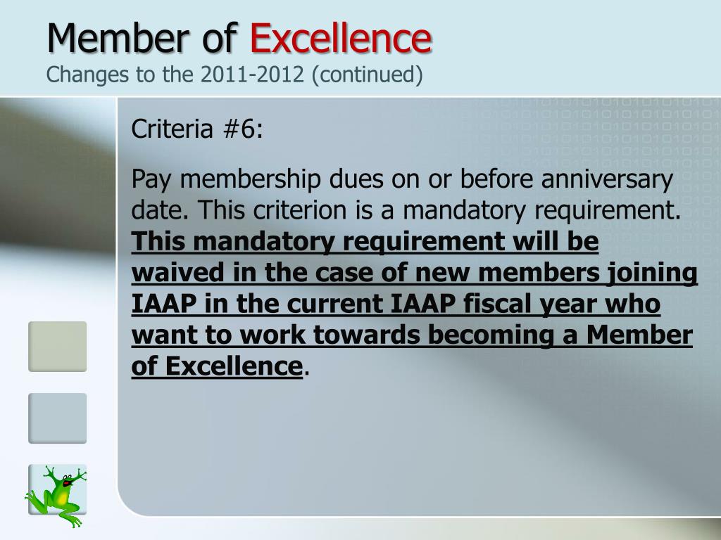 Member of Excellence Changes to the 2011-2012 (continued) Criteria #6: Pay membership dues on or before anniversary date. This criterion is a mandatory requirement. This mandatory requirement will be waived in the case of new members joining IAAP in the current IAAP fiscal year who want to work towards becoming a Member of Excellence.