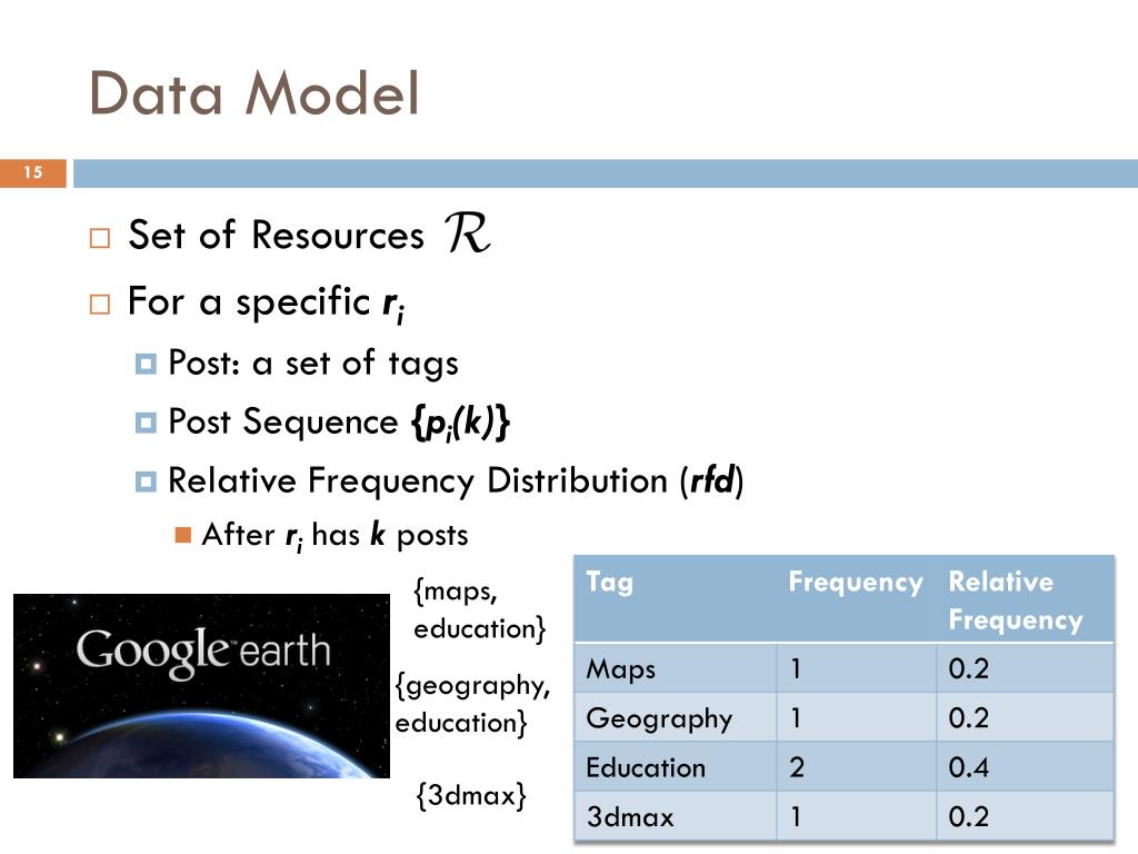 Data Model • Set of Resources • For a specific ri • Post: a set of tags • Post Sequence {pi(k)} • Relative Frequency Distribution (rfd) • After ri has k posts {maps, education} {geography, education} {3dmax}