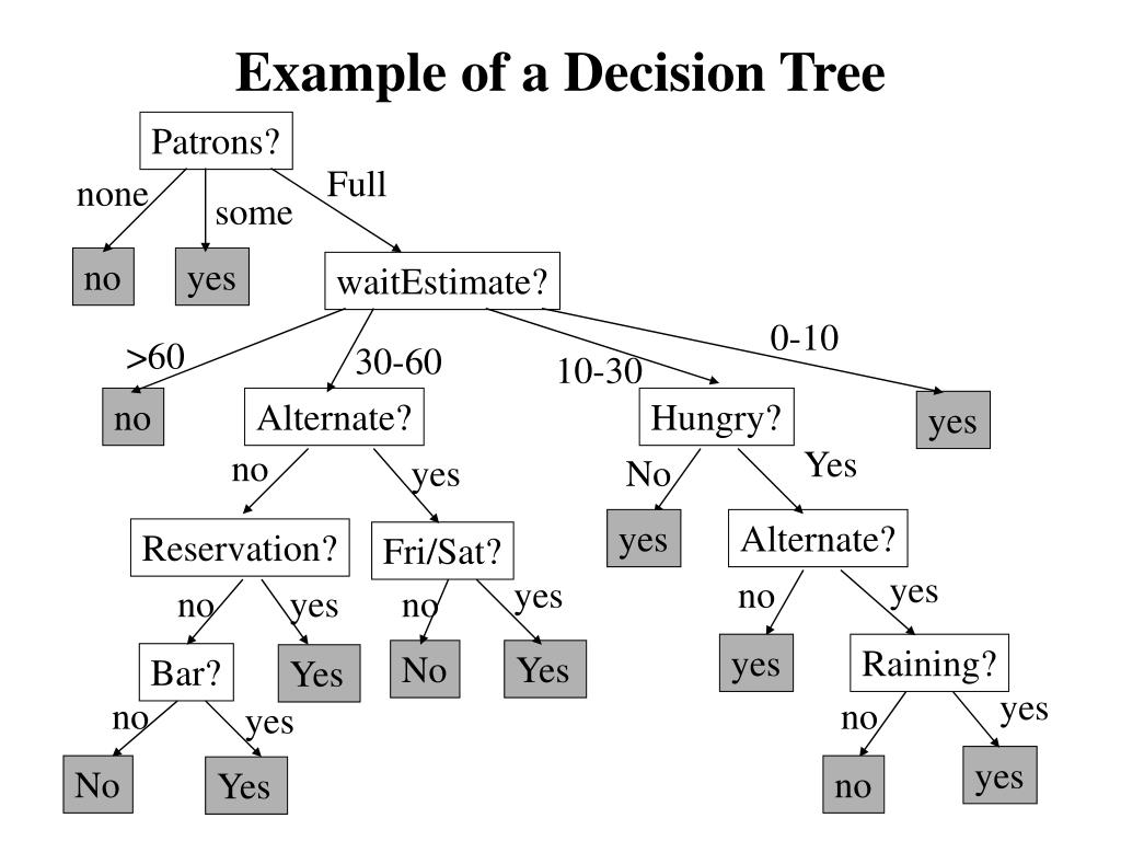 Full none some no yes waitEstimate? 0-10 >60 30-60 10-30 no Alternate? Hungry? yes Yes no yes No yes Alternate? Reservation? Fri/Sat? yes yes no no yes no yes Raining? No Yes Bar? Yes yes no no yes yes No no Yes Example of a Decision Tree Patrons?