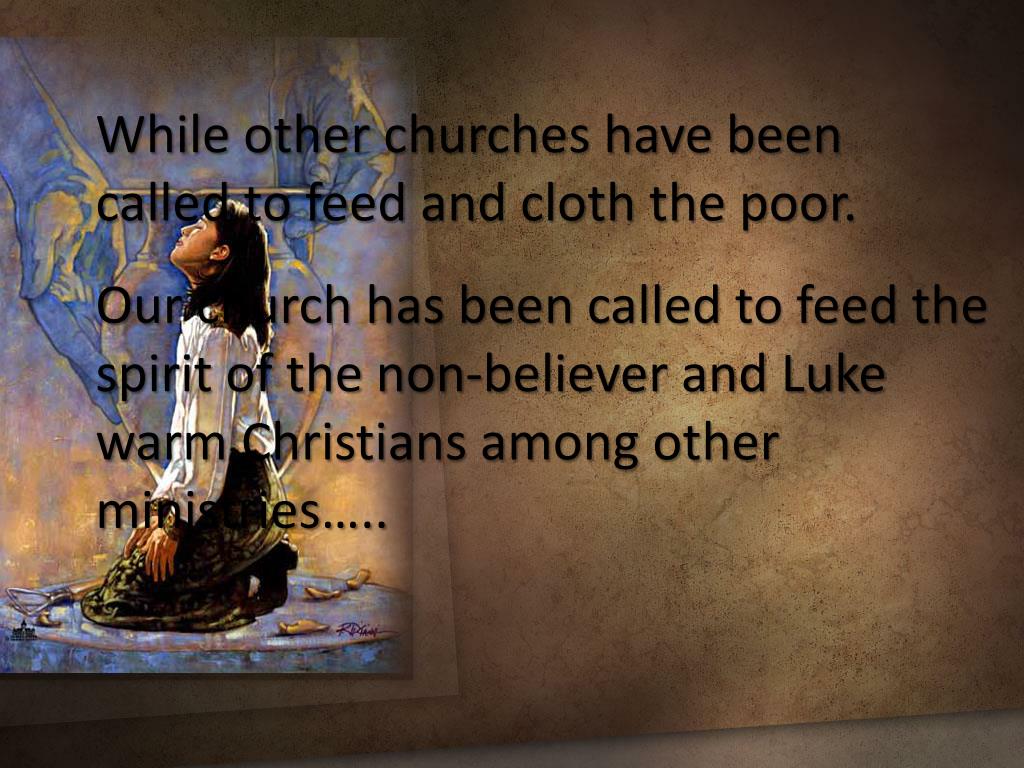 While other churches have been called to feed and cloth the poor. Our church has been called to feed the spirit of the non-believer and Luke warm Christians among other ministries…..