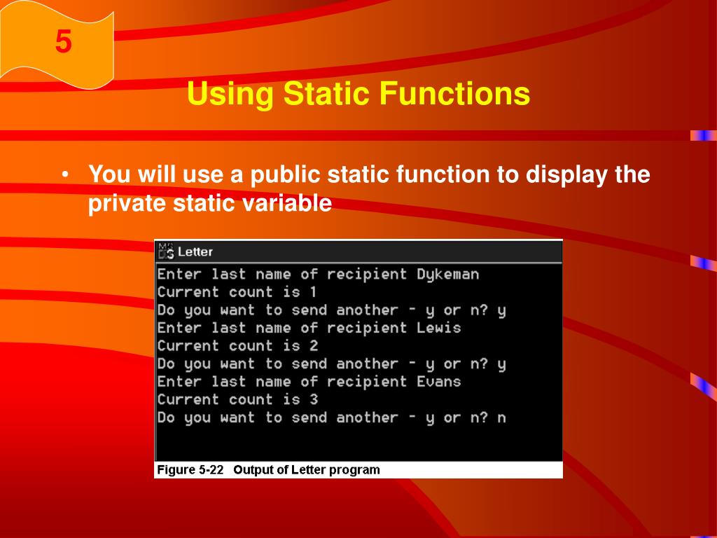 5 Using Static Functions • In the program shown in Figure 5-20, the athleticFee field is public, which is why you can access it directly, as in Student::athleticFee = 139.95; • If it were private, you would have to use a public function to access the value, as with any other private variable • Additionally, the function would have to be a static function
