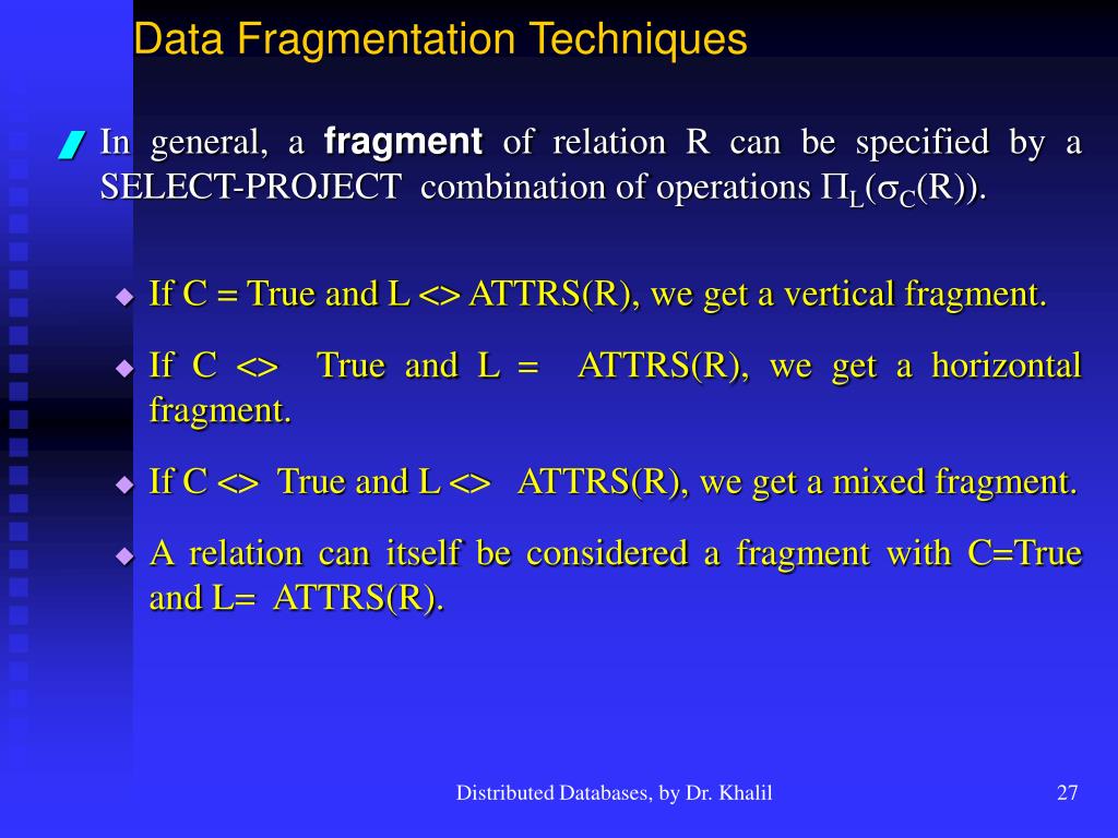 Data Fragmentation Techniques • In general, a fragment of relation R can be specified by a SELECT-PROJECT combination of operations L(C(R)). • If C = True and L <> ATTRS(R), we get a vertical fragment. • If C <> True and L = ATTRS(R), we get a horizontal fragment. • If C <> True and L <> ATTRS(R), we get a mixed fragment. • A relation can itself be considered a fragment with C=True and L= ATTRS(R). Distributed Databases, by Dr. Khalil