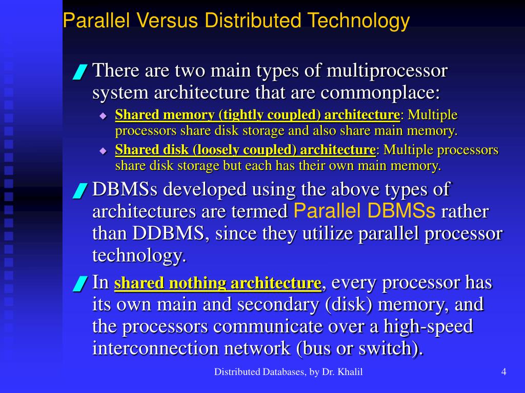 Parallel Versus Distributed Technology • There are two main types of multiprocessor system architecture that are commonplace: • Shared memory (tightly coupled) architecture: Multiple processors share disk storage and also share main memory. • Shared disk (loosely coupled) architecture: Multiple processors share disk storage but each has their own main memory. • DBMSs developed using the above types of architectures are termed Parallel DBMSs rather than DDBMS, since they utilize parallel processor technology. • In shared nothing architecture, every processor has its own main and secondary (disk) memory, and the processors communicate over a high-speed interconnection network (bus or switch). Distributed Databases, by Dr. Khalil