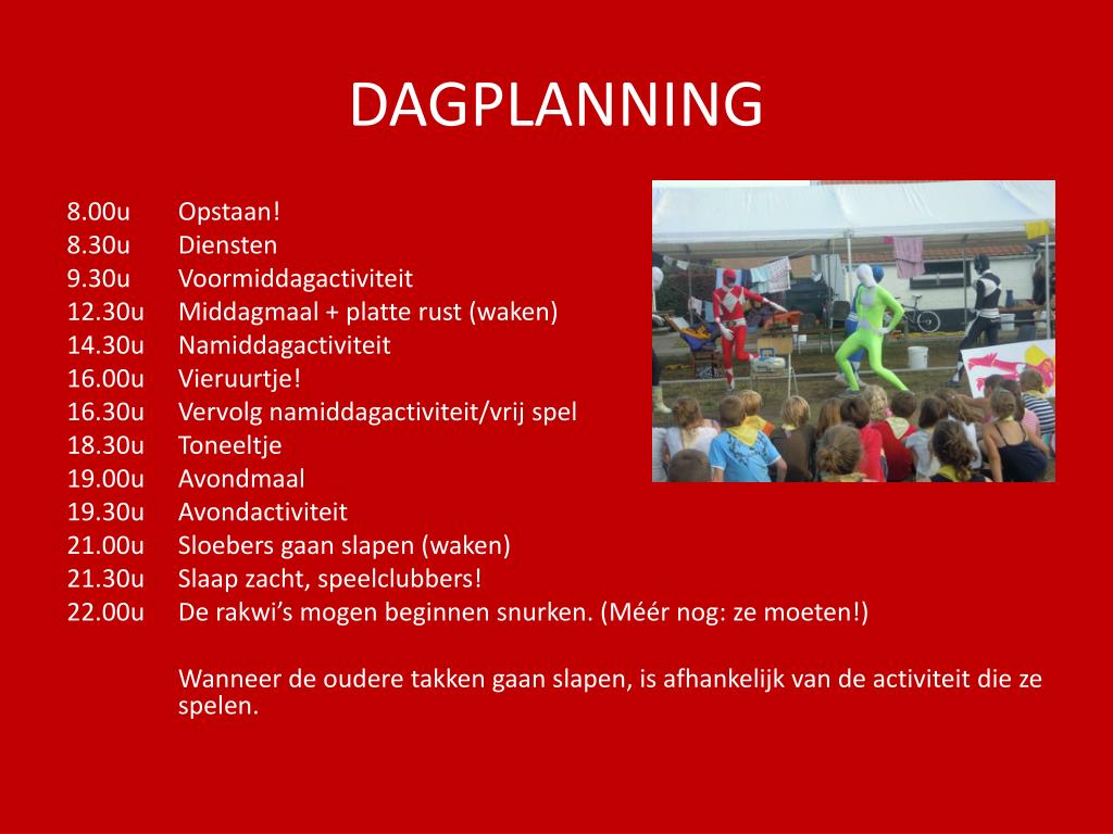 DAGPLANNING 8.00u Opstaan! 8.30u Diensten 9.30u Voormiddagactiviteit 12.30u Middagmaal + platte rust (waken) 14.30u Namiddagactiviteit 16.00u Vieruurtje! 16.30u Vervolg namiddagactiviteit/vrij spel 18.30u Toneeltje 19.00u Avondmaal 19.30u Avondactiviteit 21.00u Sloebers gaan slapen (waken) 21.30u Slaap zacht, speelclubbers! 22.00u De rakwi’s mogen beginnen snurken. (Méér nog: ze moeten!) Wanneer de oudere takken gaan slapen, is afhankelijk van de activiteit die ze spelen.