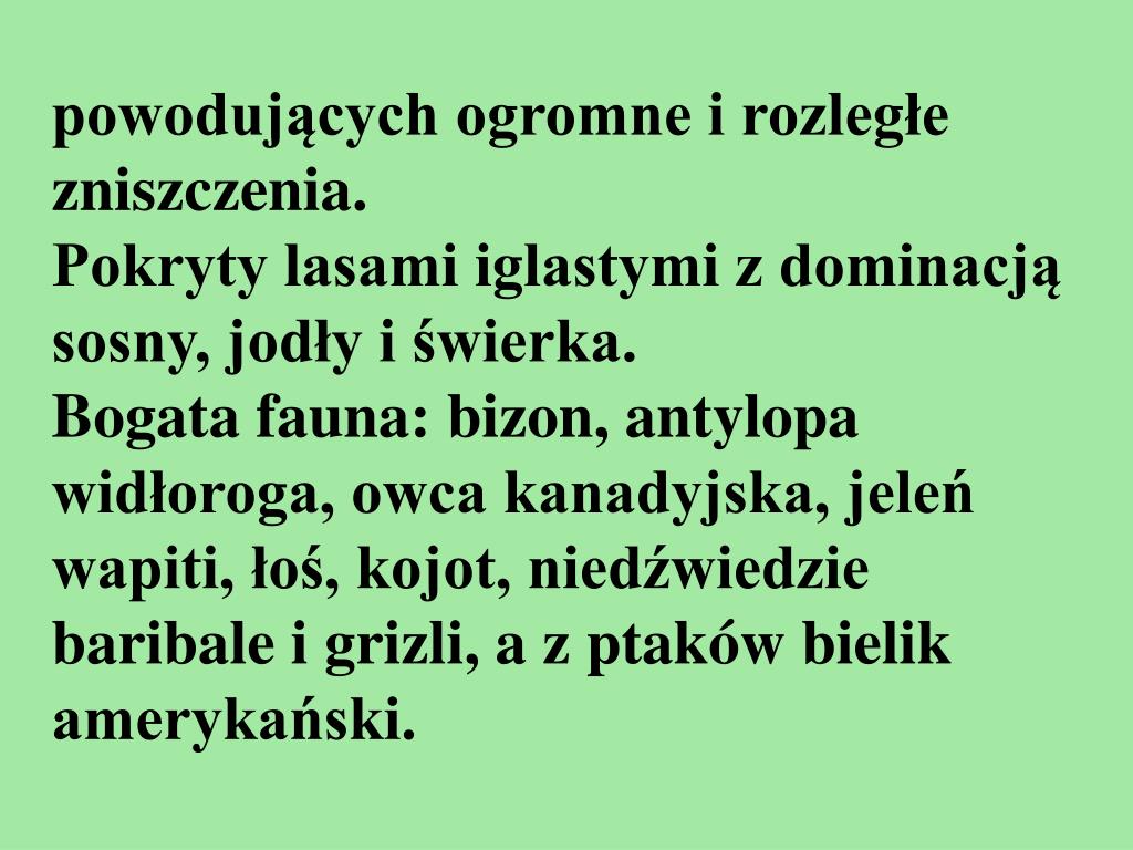powodujących ogromne i rozległe zniszczenia. Pokryty lasami iglastymi z dominacją sosny, jodły i świerka. Bogata fauna: bizon, antylopa widłoroga, owca kanadyjska, jeleń wapiti, łoś, kojot, niedźwiedzie baribale i grizli, a z ptaków bielik amerykański.
