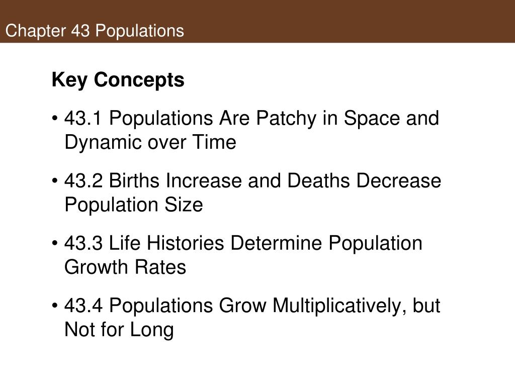 43. Populations. Chapter 43 Populations. Key Concepts 43.1 Populations Are Patchy in Space and Dynamic over Time 43.2 Births Increase and Deaths Decrease Population Size 43.3 Life Histories Determine Population Growth Rates 43.4 Populations Grow Multiplicatively, but Not for Long.
