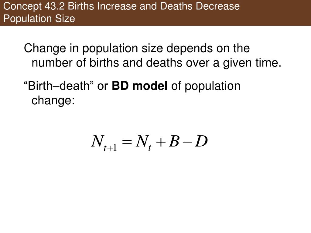Concept 43.2 Births Increase and Deaths Decrease Population Size Change in population size depends on the number of births and deaths over a given time. “Birth–death” or BD model of population change: