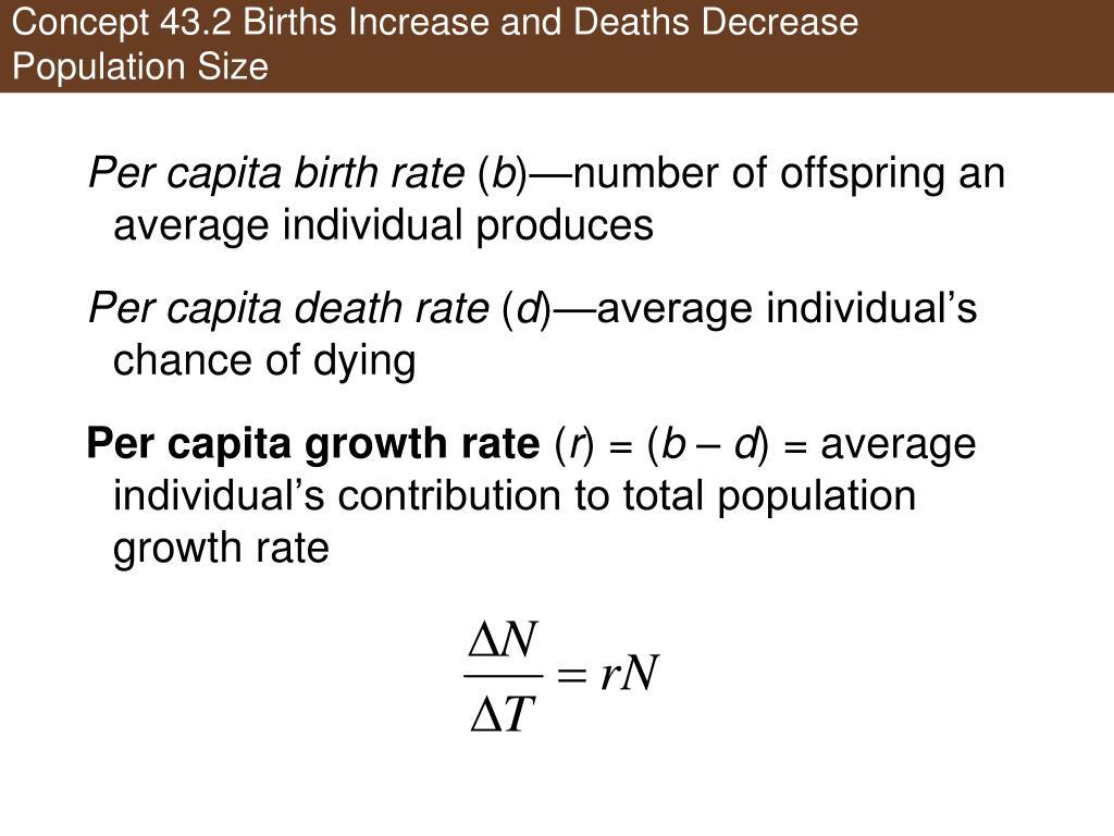 Concept 43.2 Births Increase and Deaths Decrease Population Size Per capita birth rate (b)—number of offspring an average individual produces Per capita death rate (d)—average individual’s chance of dying Per capita growth rate (r) = (b – d) = average individual’s contribution to total population growth rate
