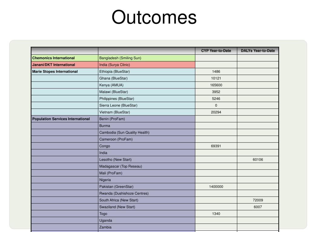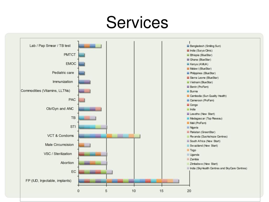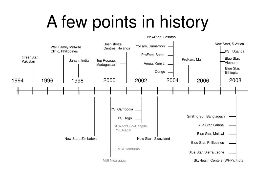 A few points in history NewStart, Lesotho New Start, S.Africa Dushishoze Centres, Rwanda ProFam, Cameroon Well Family Midwife Clinic, Philippines PSI, Uganda ProFam, Benin GreenStar, Pakistan Blue Star,Vietnam ProFam, Mali Janani, India Top Reseau, Madagascar Amua, Kenya Blue Star, Ethiopia Congo 2000 2004 2008 1994 1996 2002 2006 1998 PSI,Cambodia Smiling Sun Bangladesh PSI,Togo Blue Star, Ghana SEWA/PSSN/Sangini, PSI, Nepal Blue Star, Malawi New Start, Zimbabwe New Start, Swaziland Blue Star, Philippines MSI Honduras Blue Star, Sierra Leone MSI Nicaragua SkyHealth Centers (WHP), India