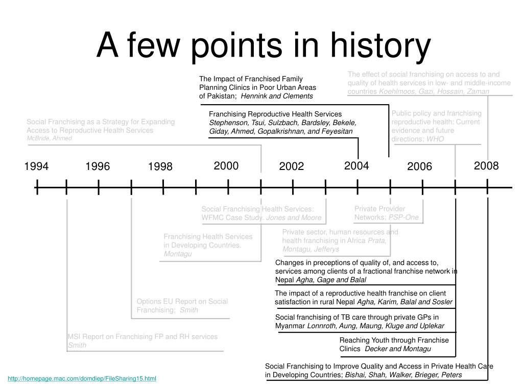 A few points in history The effect of social franchising on access to and quality of health services in low- and middle-income countries Koehlmoos, Gazi, Hossain, Zaman The Impact of Franchised Family Planning Clinics in Poor Urban Areas of Pakistan; Hennink and Clements Public policy and franchising reproductive health: Current evidence and future directions; WHO Franchising Reproductive Health Services Stephenson, Tsui, Sulzbach, Bardsley, Bekele, Giday, Ahmed, Gopalkrishnan, and Feyesitan Social Franchising as a Strategy for Expanding Access to Reproductive Health Services McBride, Ahmed 2000 2004 2008 1994 1996 2002 2006 1998 Private Provider Networks; PSP-One Social Franchising Health Services: WFMC Case Study. Jones and Moore Private sector, human resources and health franchising in Africa Prata, Montagu, Jefferys Franchising Health Services in Developing Countries. Montagu Changes in preceptions of quality of, and access to, services among clients of a fractional franchise network in Nepal Agha, Gage and Balal The impact of a reproductive health franchise on client satisfaction in rural Nepal Agha, Karim, Balal and Sosler Options EU Report on Social Franchising; Smith Social franchising of TB care through private GPs in Myanmar Lonnroth, Aung, Maung, Kluge and Uplekar MSI Report on Franchising FP and RH services Smith Reaching Youth through Franchise Clinics Decker and Montagu Social Franchising to Improve Quality and Access in Private Health Care in Developing Countries; Bishai, Shah, Walker, Brieger, Peters http://homepage.mac.com/domdiep/FileSharing15.html